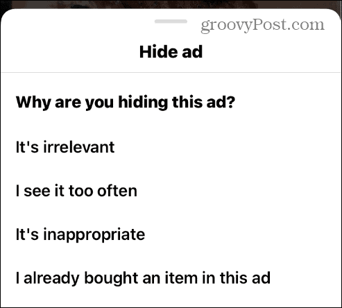 - Ahora, elige por qué quieres ocultar el anuncio en el siguiente menú.
