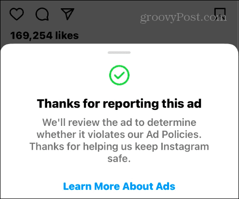 - Instagram mostrará un mensaje de verificación que le informará que no volverá a mostrar el anuncio.
