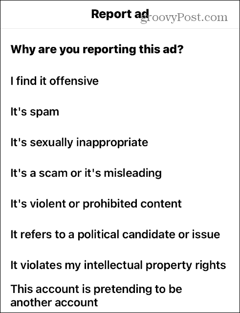- En el siguiente menú, elige por qué estás denunciando el anuncio.