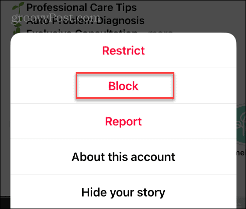 - Verifique si desea bloquear la marca y otras cuentas, ellos crearon o solo el perfil del anunciante y toque el Bloquear botón.