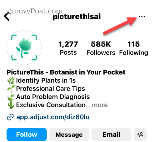 - Cuando se abra el perfil del anunciante, toque el tres puntos botón en la esquina superior derecha del perfil.