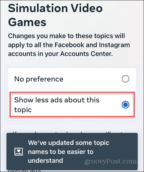 - Cambie la opción de Sin preferencias a Mostrar menos anuncios sobre este tema.